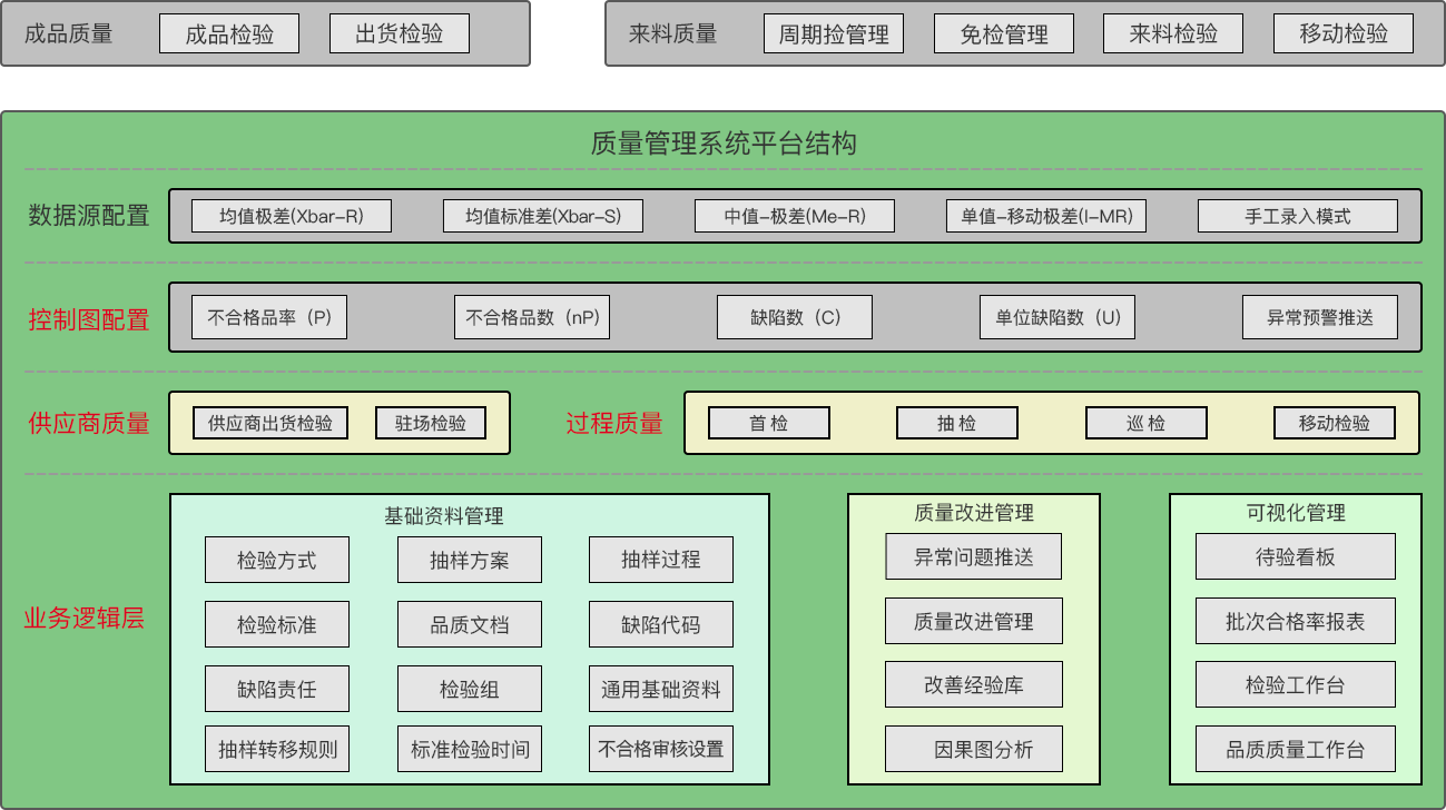 質(zhì)量管理系統(tǒng)技術(shù)架構(gòu)分為數(shù)據(jù)源配置、控制圖配置、供應(yīng)商過程質(zhì)量、業(yè)務(wù)邏輯層,整個系統(tǒng)是復(fù)雜而龐大的,但這確保了質(zhì)量管理系統(tǒng)的高效運行和數(shù)據(jù)可控性。